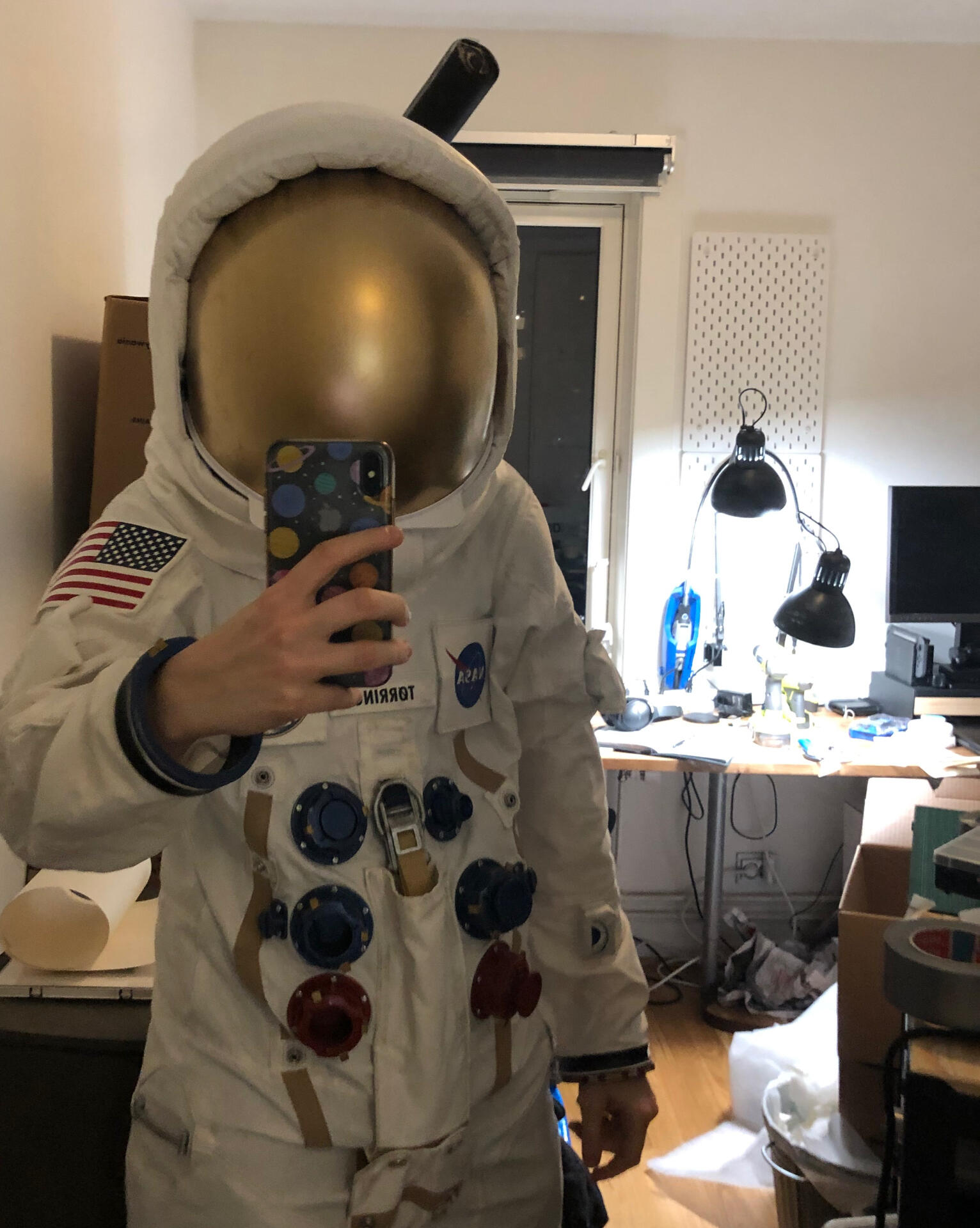 Meet the crew:Frida "Armstrong" Tørring is a designer and student at AHO and has spent the past ten years making everything from comic conventions to T-shirt companies and fantasy creature costumes.Hans Gerhard "Buzz" Meier (aka @smogdog) is an artist, designer, and teacher at AHO participating in the new wave of creative and artistic people who share ideas, processes, and tips on social media, known as the Maker movement.Eric Michael "Collins" Molumby is a master student studying interaction design at AHO. His role in the team has been to help curate the exhibition and keep the two astronauts from flying too close to the sun.